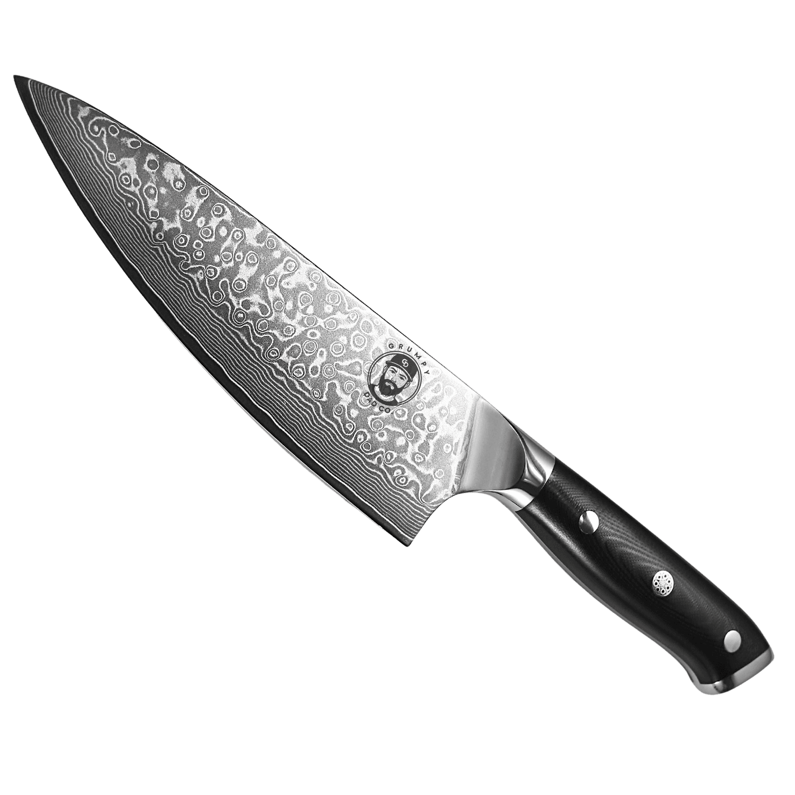 Grumpy Dad Co 8″ Damascus Chef Knife – Hand-Finished Kitchen Knife with G10 Handle & Mosaic Pin | Razor-Sharp Japanese Style Blade | Food-Safe Steel Certified | Bold Gift for Culinary Dads