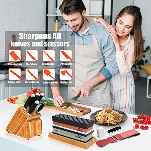 Restore razor-sharp edges fast with this professional whetstone knife sharpening stone set. Dual two-sided stones (400/1000 and 3000/8000 grits) plus non-slip base, leather strop, flattening stone and angle guide give you everything to sharpen, refine and polish knives like a pro.