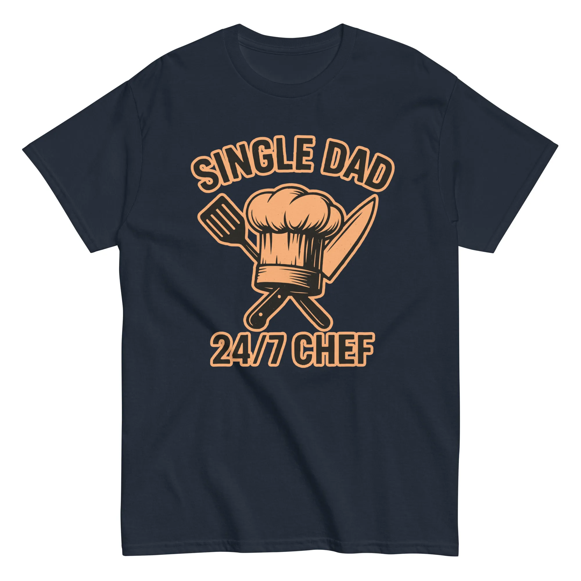 Being a single dad means you dont just run the houseyou run the kitchen like a diner that never closes. This Single Dad 24/7 Chef shirt is a badge of honor for the guy whos part cook, part dishwasher, part magician making chicken nuggets appear in record time. Built from premium cotton, its durable enough for sauce splatters and comfortable enough for collapsing after bedtime snacks are served. Limited editionget yours before another dad steals your chefs hat.